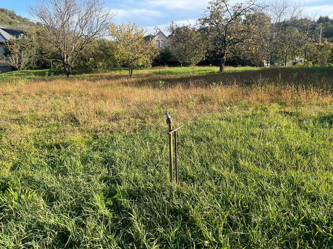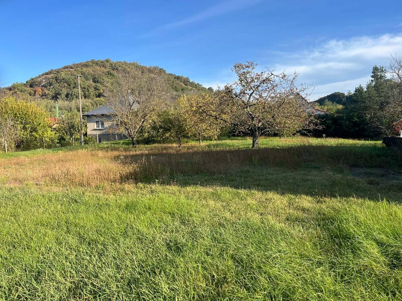 Víz és csatorna beállás a telken belül van, a telken a kerítésen belül egy villanyoszlop áll.