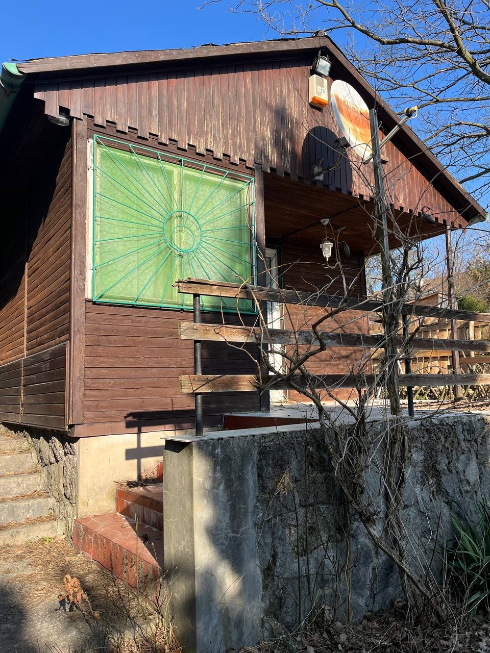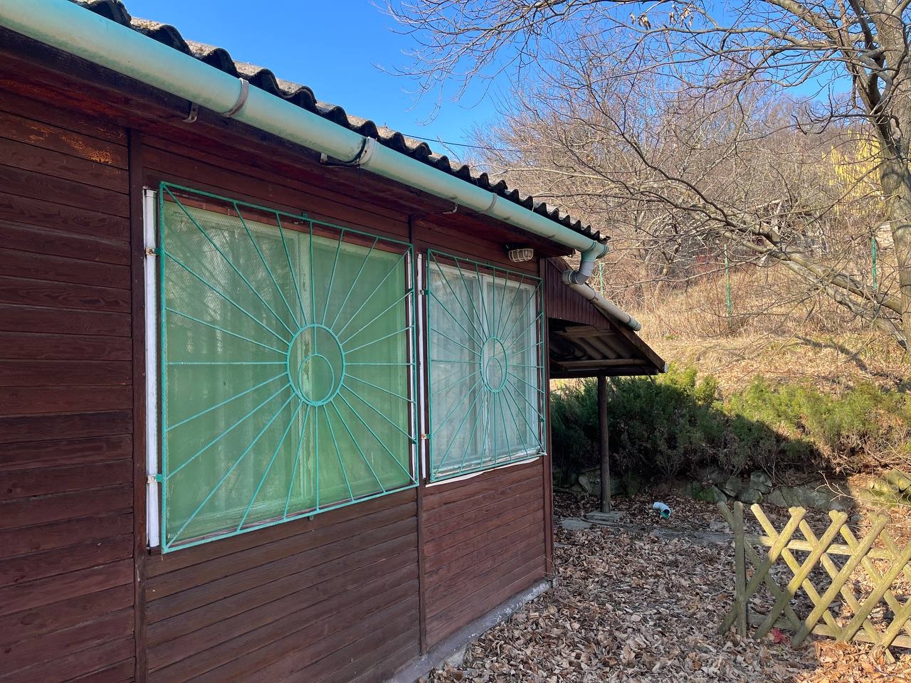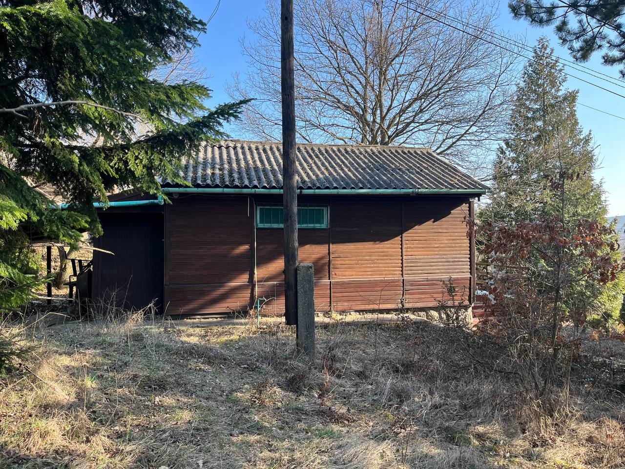 A telek az utcafront felől emelkedik, rajta érett növényzet, egy 36 nm-es faház, víz és villany közmű található. A ház teljesen szabályosan épült, a térképmásolaton szerepel. A kert valamikor szépen volt parkosítva, kis munkával ismét széppé varázsolható. A terület másik fele ugyanekkora, el van kerítve, de az a társtulajdonosé.