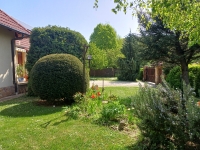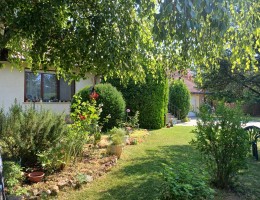 A kert nagyon szép, gondozott, érett növényzettel, virágokkal teli.