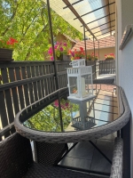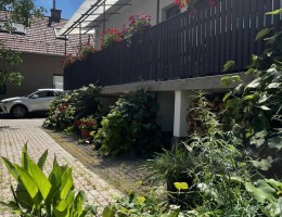A lakószint előtt teljes épülethosszúságban hangulatos "muskátlis" terasz húzódik. Innen nyílik panoráma szemközti hegyek felé. A terasz is új burkolatot kapott.