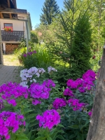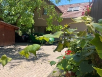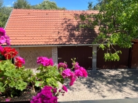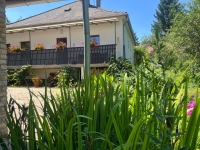 A ház körül a kert egy része térkövezett, másik része fás, virágos, a kert hátulja a patakkal határos, rendkívül hangulatos.
